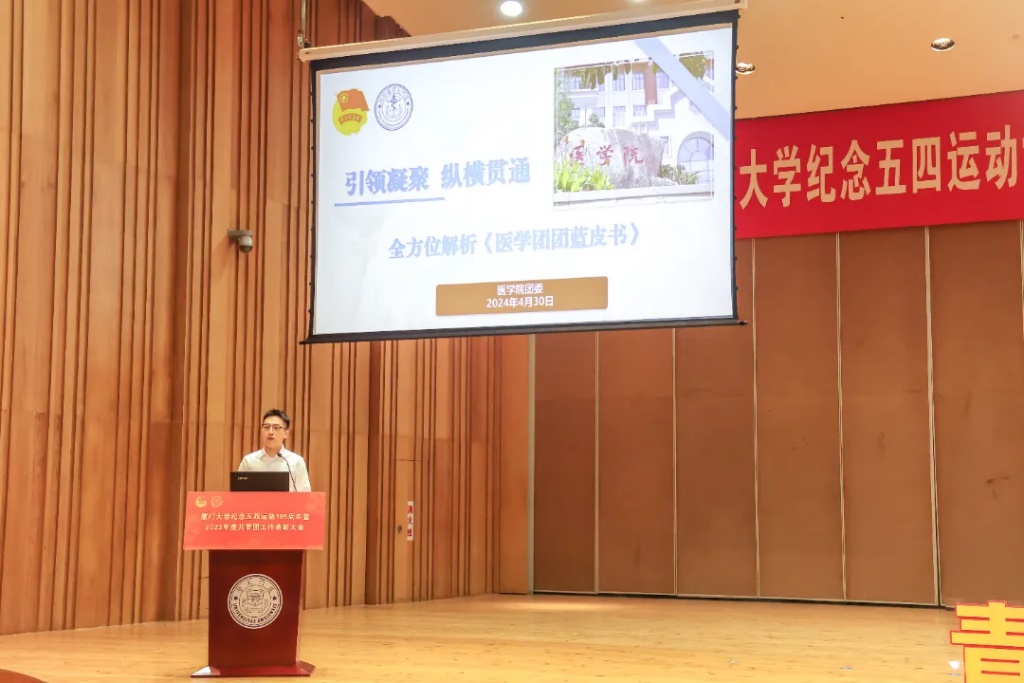 医学院团委荣获“2023年度厦门大学五四红旗团委”; 本科生2021级护理班团支部等6个团支部荣获“2023年度厦门大学五四红旗团支部”; 杨棋翔等8人荣获“2023年度厦门大学优秀团支部(团总支)书记”; 毋思思、杨博等46人荣获“2023年度厦门大学优秀共青团员”。学院团委书记邱超超作为获奖学院代表在表彰大会上做学院团委工作汇报。