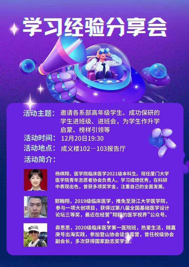 为进一步加强学风建设,培育优良学风,营造良好学习氛围,增强学生学业主动性,强化朋辈帮扶,充分发挥优秀学生的榜样示范引领作用,2023年12月20日,厦门大学医学院2023级临床医学班级在成义楼102报告厅举办朋辈学习经验分享会,活动邀请到2019级临床医学专业郭翰翔、2020级临床医学专业毋思思、2021级临床医学专业杨棋翔分享大学学业规划和学习经验。本次分享会由2023级临床医学三班主办,班主任闫国良参加。活动由班级团支书陈思晴主持。