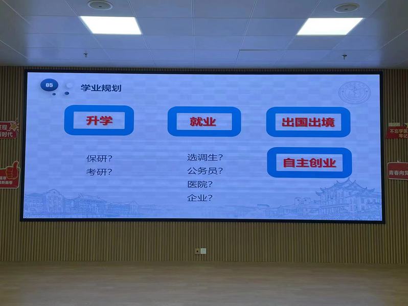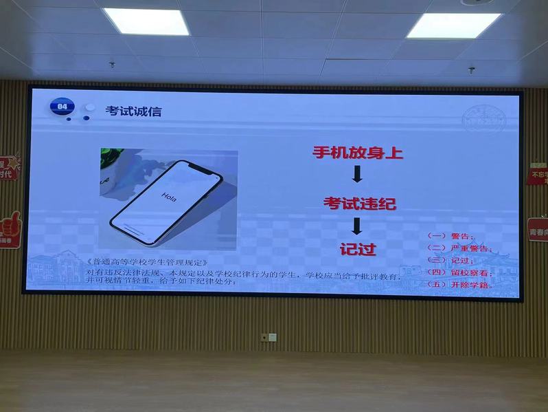 之后是考试诚信和学业规划问题,考试诚信方面许洋再三强调严禁考试作弊,告诫同学们不要心存侥幸心理,并展示了考试违规处理办法和以往的考试作弊处分案例,提醒同学们引以为戒,诚信考试。学业规划方面,许洋从升学、就业、出国出境、自主创业等四个方向建议大家从自身实际出发,立足当下,提前规划未来,机会是留给有准备的人,希望大家都可以早早行动起来。