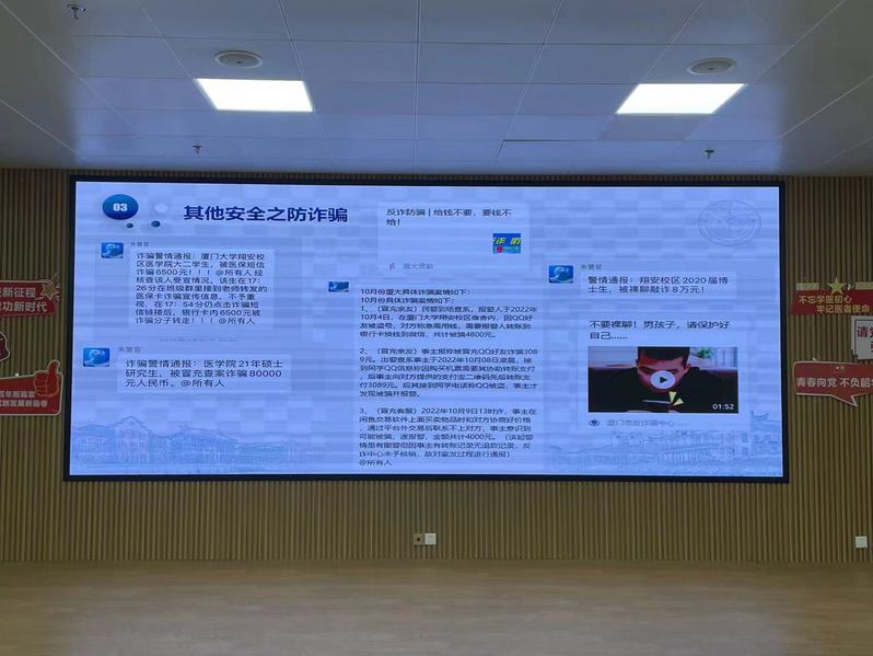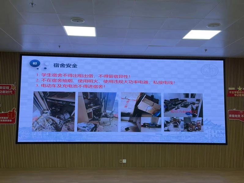 接下来许洋对同学们进行了宿舍安全教育,督促同学们提高安全防范意识。强调宿舍不得出租出借,不得留宿异性,不得在宿舍抽烟、使用明火、使用违规大功率电器、私接电线,电动车及充电池不得进宿舍等。在其他安全方面,许洋主要强调了防溺水、交通安全和谨防诈骗等,叮嘱同学们牢记“给钱不要、要钱不给”八字真言。