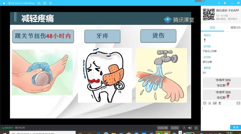 2020年4月9日19时30分,由护理系副教授沈曲指导、《护理教育学》课程第3实践小组组织的《冷热疗法科普小课堂》活动在腾讯课堂APP进行。本次活动吸引了校内外许多大学生的关注,共有30人参与在线的网络课程。