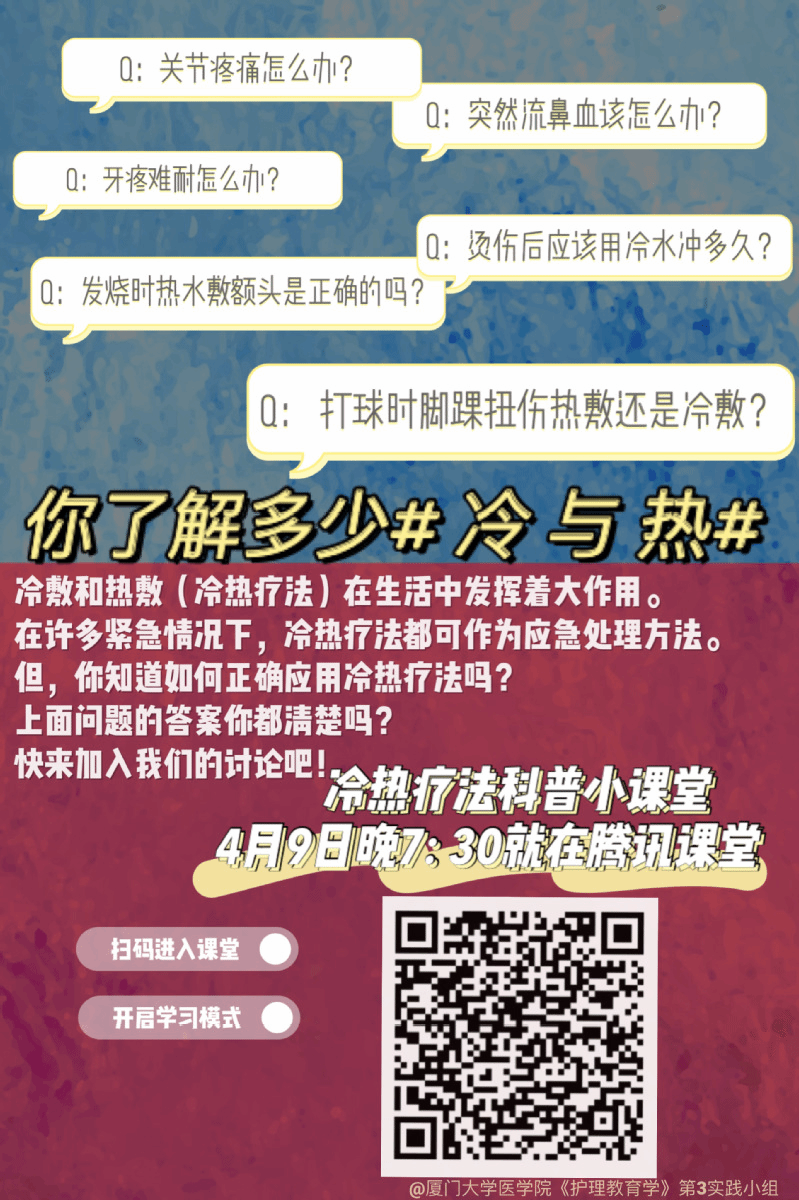 本次活动是护理系同学对《护理教育学》课程的第一次实践。疫情期间人们对医疗卫生的重视让实践小组有了做冷热疗法科普的念头。实践过程中,实践小组遇到了不少难题和挑战,在老师的帮助及组员们的积极配合中不断被解决和克服。虽然本次实践活动仍有许多不足之处,但也让实践小组和参与活动的同学都收获满满,期待更好的第三实践小组!