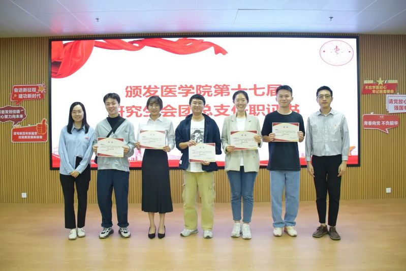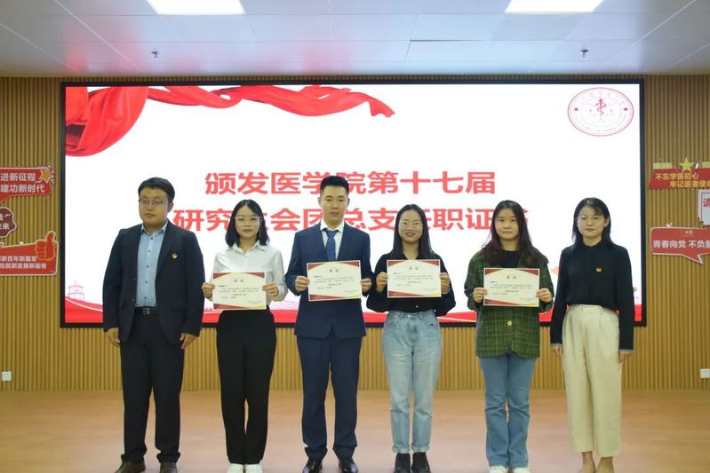 乐无恙为第十七届研究生会、研究生团总支主要负责人颁发任职证书。邱超超、鲍小佳、谢彦贞、洪子茜为研究生会团总支优秀学生干部颁发荣誉证书。