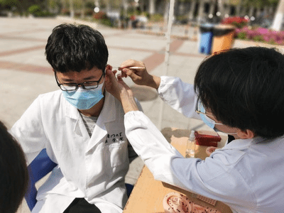 针灸,包括针法和灸法。这次义诊中主要使用针法,在中医理论的指导下把针具(通常指毫针)按照一定的角度刺入体内,运用捻转与提插等针刺手法来对人体特定部位进行刺激从而达到治疗疾病的目的。