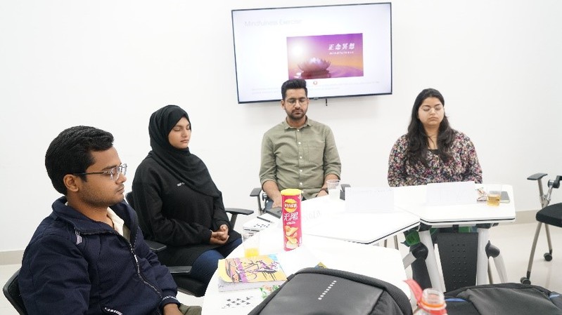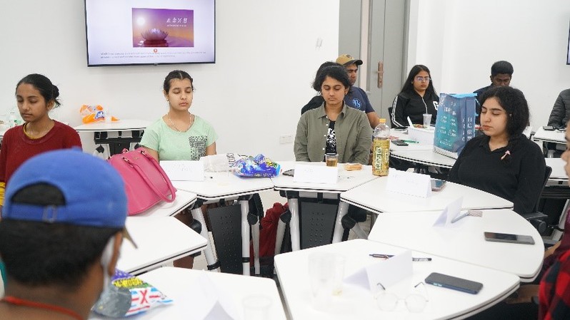 最后,留学生们在有节奏的引导下,闭目端坐,开启了30分钟的“正念冥想”之旅,以这样的方式进行放松练习,学习静心、缓解焦虑。